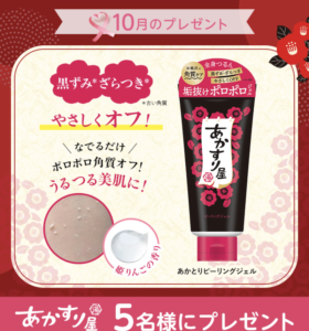 今月のプレゼントはあかすり屋「あかとりピーリングジェル」。やさしくなでて、古い角質をポロポロとオフ!黒ずみやざらつきをケアして全身つるん。