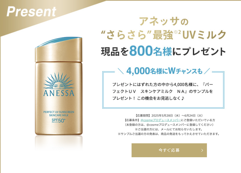 【アネッサ】「パーフェクトUV スキンケアミルク」現品プレゼント(〜6/24まで)
