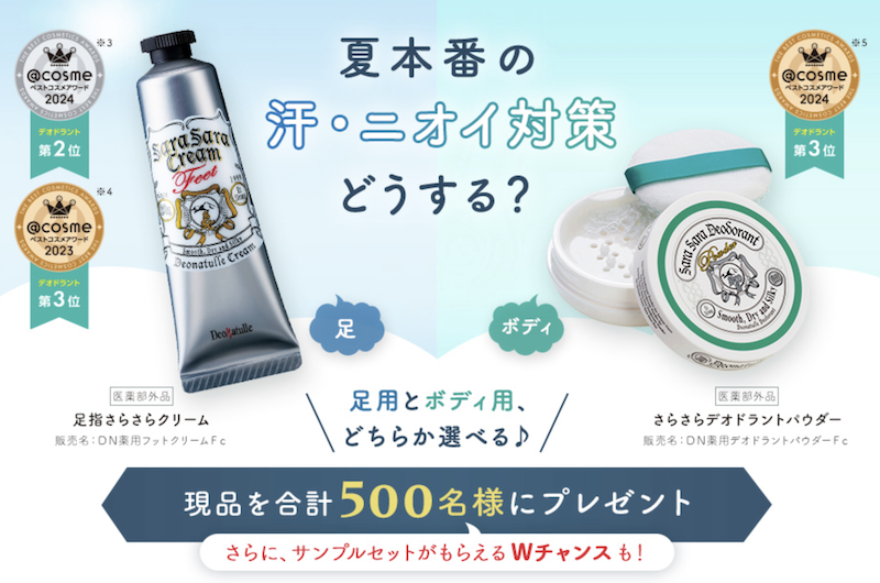 【デオナチュレ】「足指さらさらクリーム」または「デオドラントパウダー」現品プレゼント(〜7/22まで)