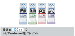 今月のプレゼントは「ネピア wetomo」4種セットです。お出かけ先で便利なウェットティッシュ。ノンアルコール除菌タイプや保湿タイプなど、4つの種類をセットでプレゼント。