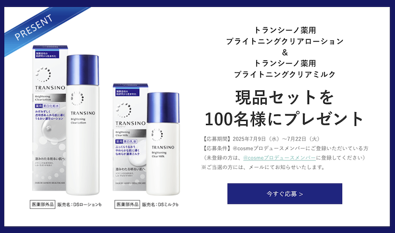 【トランシーノ】「ブライトニングクリアローション&ミルク」現品セットプレゼント(〜7/22まで)
