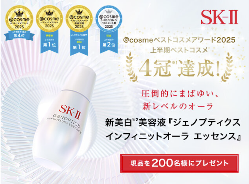 【SK-II】「ジェノプティクス インフィニットオーラ エッセンス」現品プレゼント(〜2025/7/8まで)