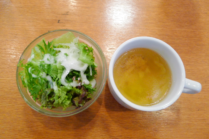 スープとサラダ、飲み物が付きます。スープはオーソドックスなコンソメスープ。